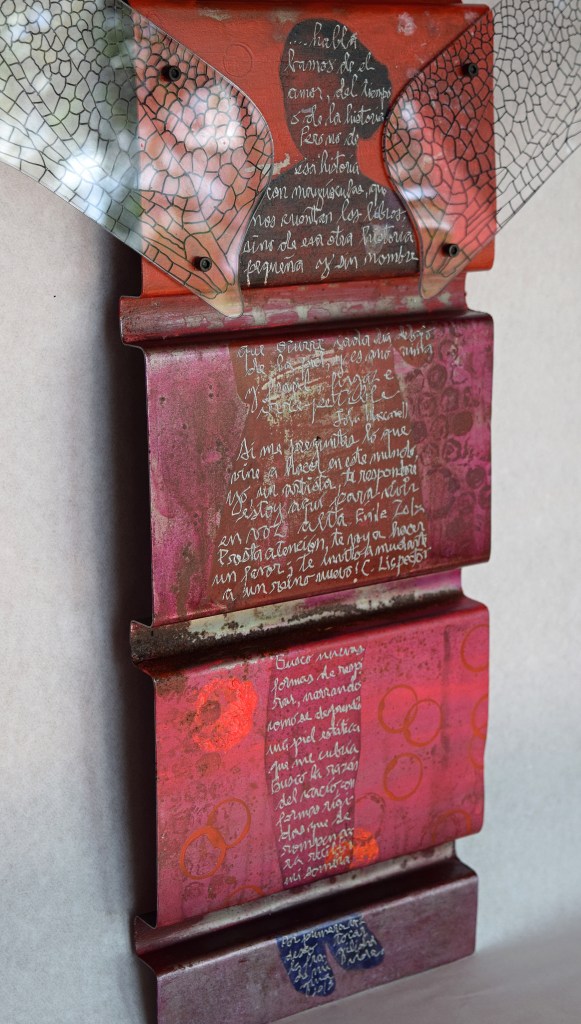 Mixed media and dremel on corrugated metal plate + acrylic wings,