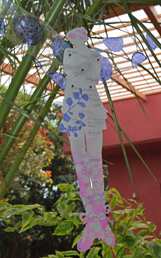 Mixed media and silver leaf on wood + acrylic wings, all recycled materials