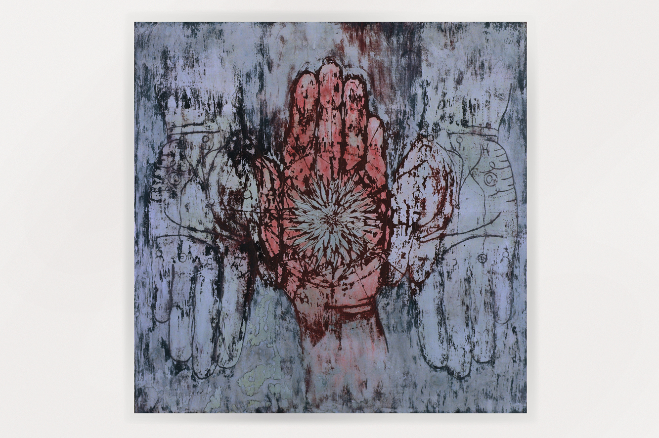 Punta seca, transferencia y acrílico sobre papel de fibras hecho a mano