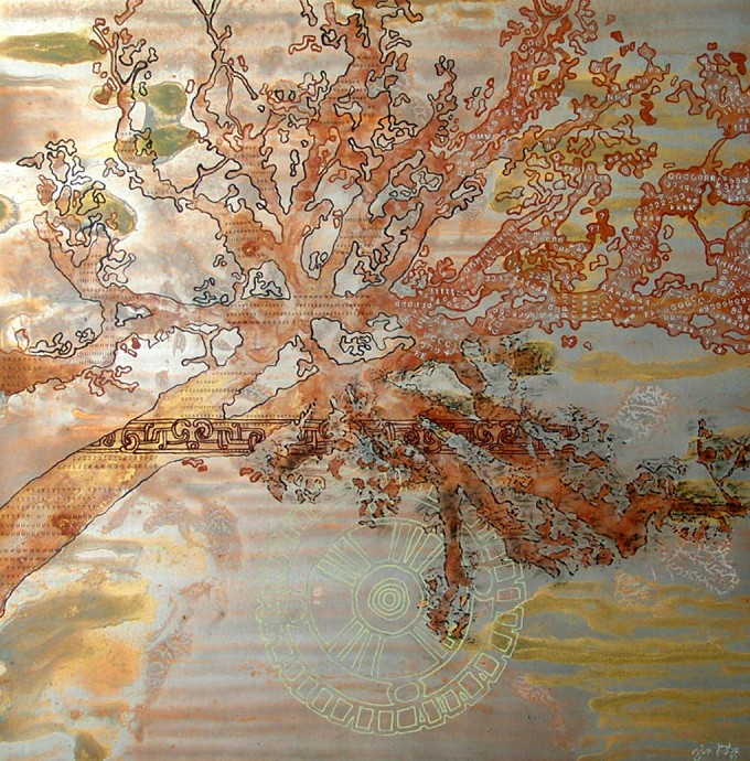 Punta seca, pátina, acrílico, óleo y hoja de plata sobre aluminio