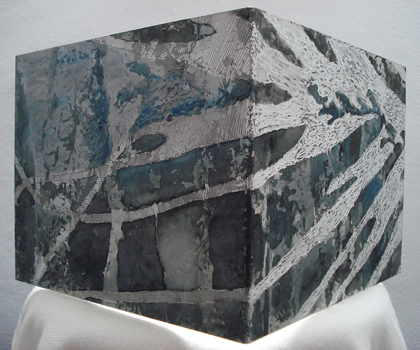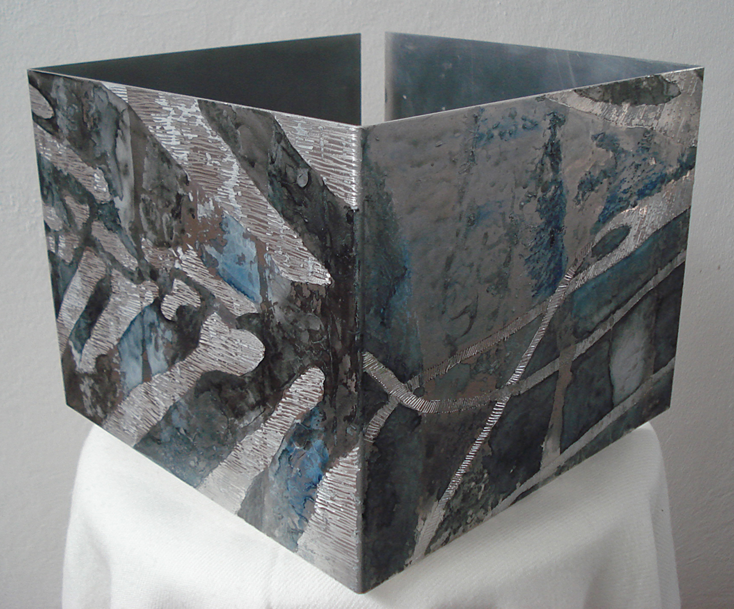 Dremel, punta seca y tintas sobre lámina de aluminio doblada