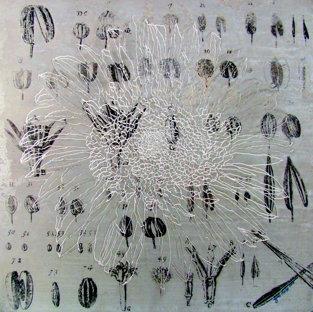 Punta seca, acrílicos y transferibles sobre aluminio,